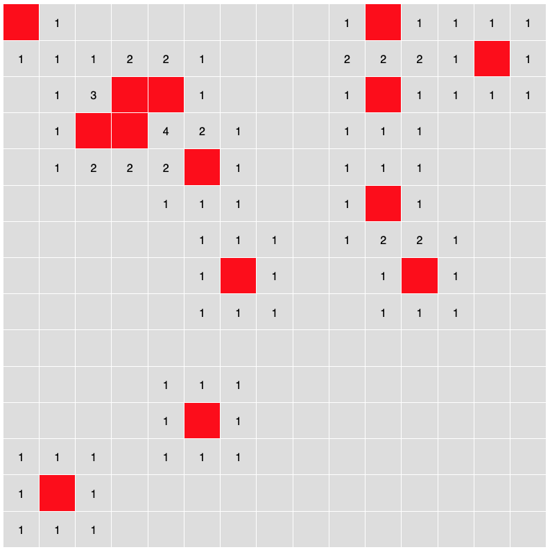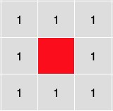Calculating the neighbor-numbers was the most difficult part of the development. In minesweeper, a cell that contains the number 1 is indicating that one of the neighbor cells is a bomb. A cell with a neighbor-number of 2 means that 2 of the surrounding cells are bombs.